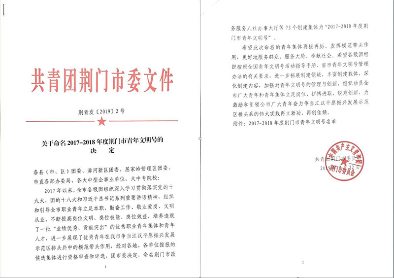近期,公司收到共青团荆门市委员会发来的奖励文件,荆门通航螺旋桨志愿服务队喜获2017-2018年度荆门市青年文明号荣誉称号。这是公司首次获此殊荣,充分体现了公司青年积极向上、